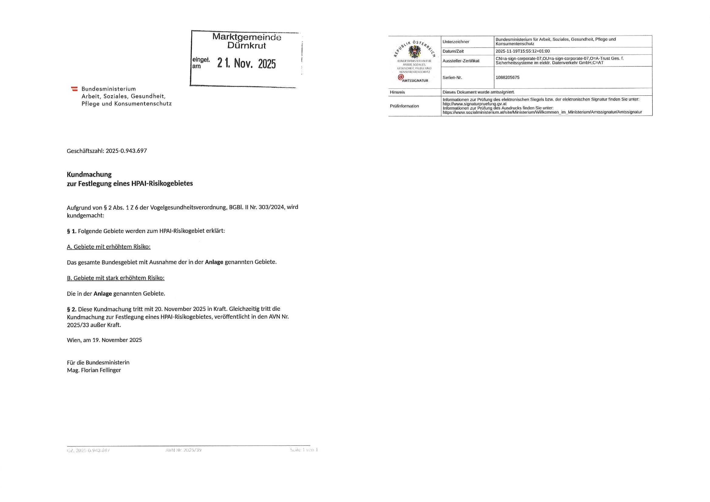 Kundmachung HPAI-Risikogebietes Fr, 21. November 2025 Aktuell