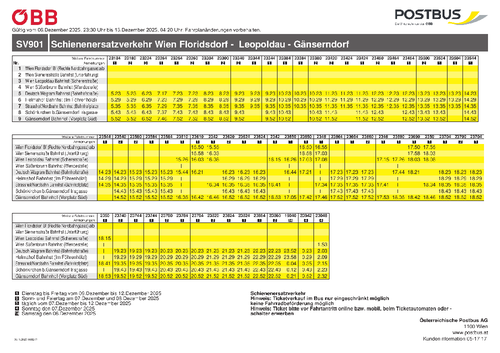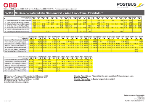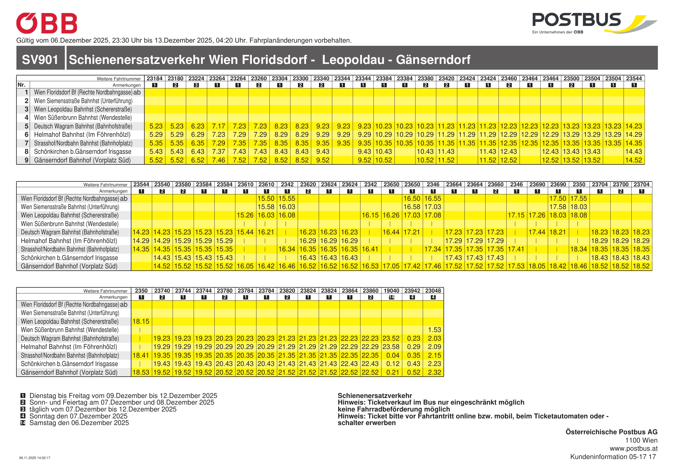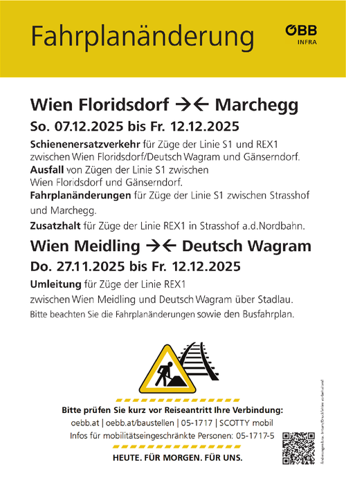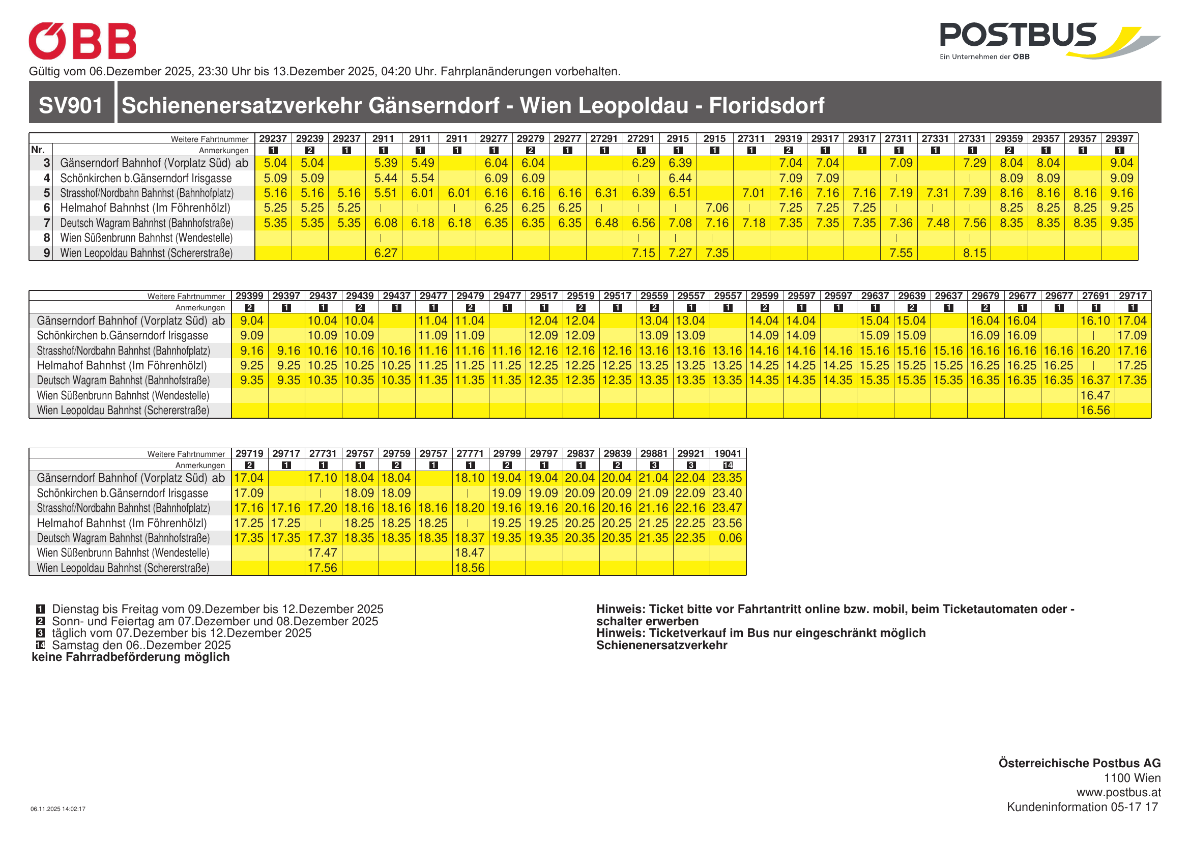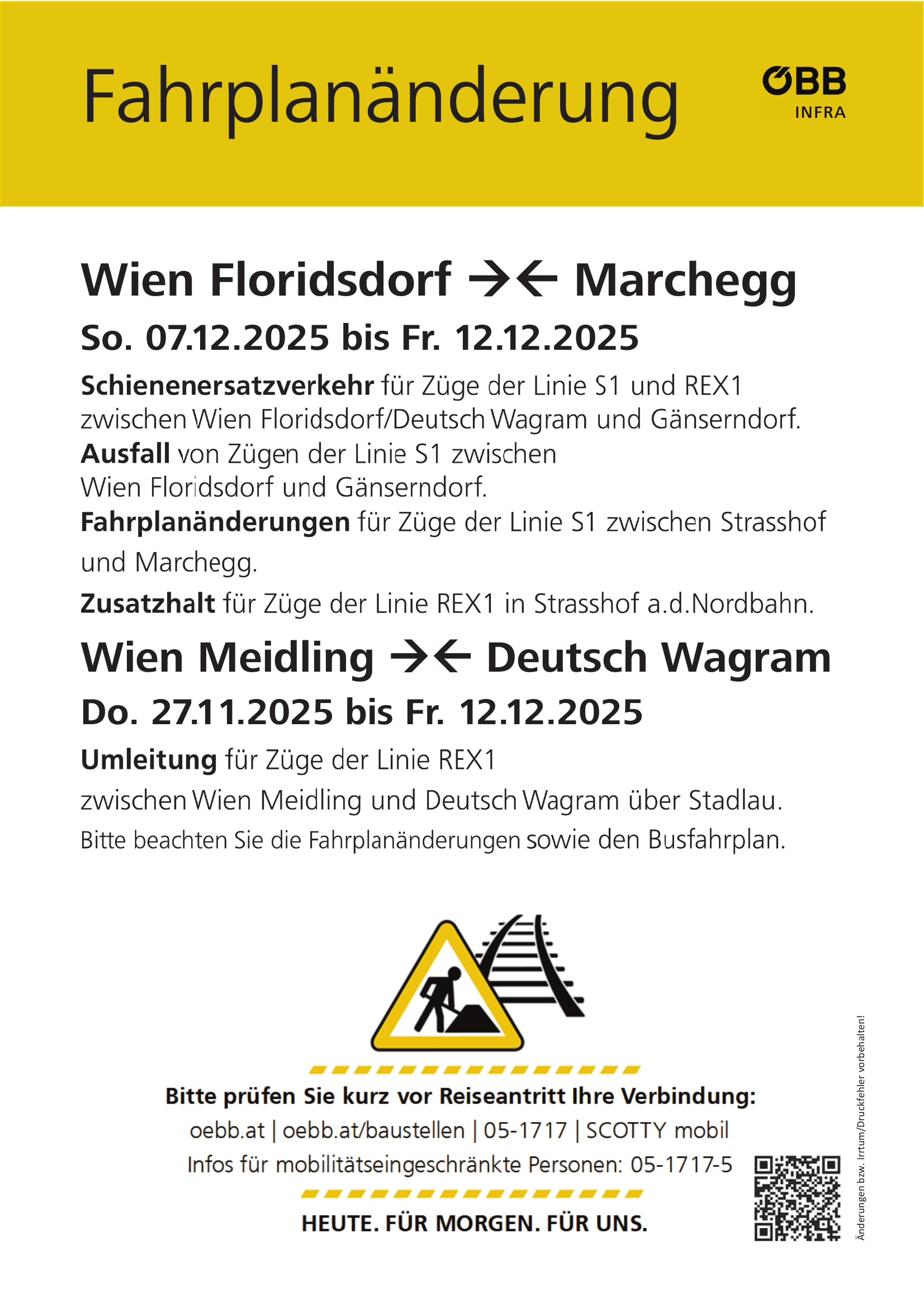 - Nachtsperre in der Nacht von 06.12. auf 07.12.2025: Schienenersatzverkehr für die S-Bahn-Züge S 23922 und S 23942, Abfahrtszeit in Wien Floridsdorf um 23:32 Uhr und 00:02 Uhr, von Deutsch Wagram bis Gänserndorf, Schienenersatzverkehr für Zug S 29019 von Gänserndorf bis Deutsch Wagram