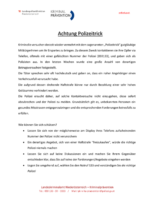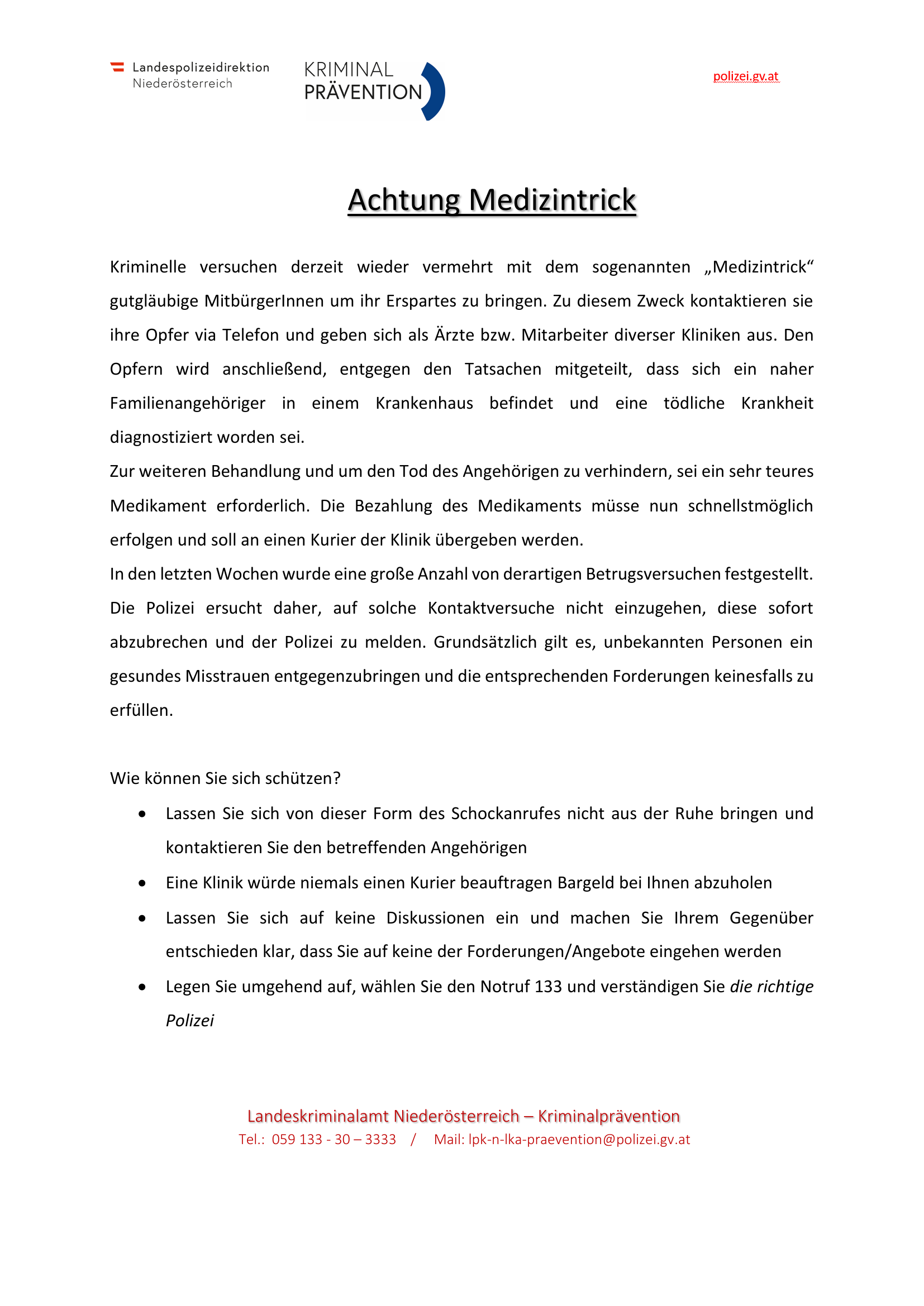 Information Landespolizeidirektion NÖ - ACHTUNG Medizintrick Do, 05. Februar 2026 Aktuell